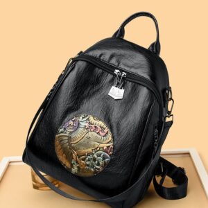 Women’s Premium PU Leather Stylish Backpack | Elephant Embossed Designer Travel & Casual Bag | Spacious Multi-Pocket Shoulder Backpack (Black / Brown)