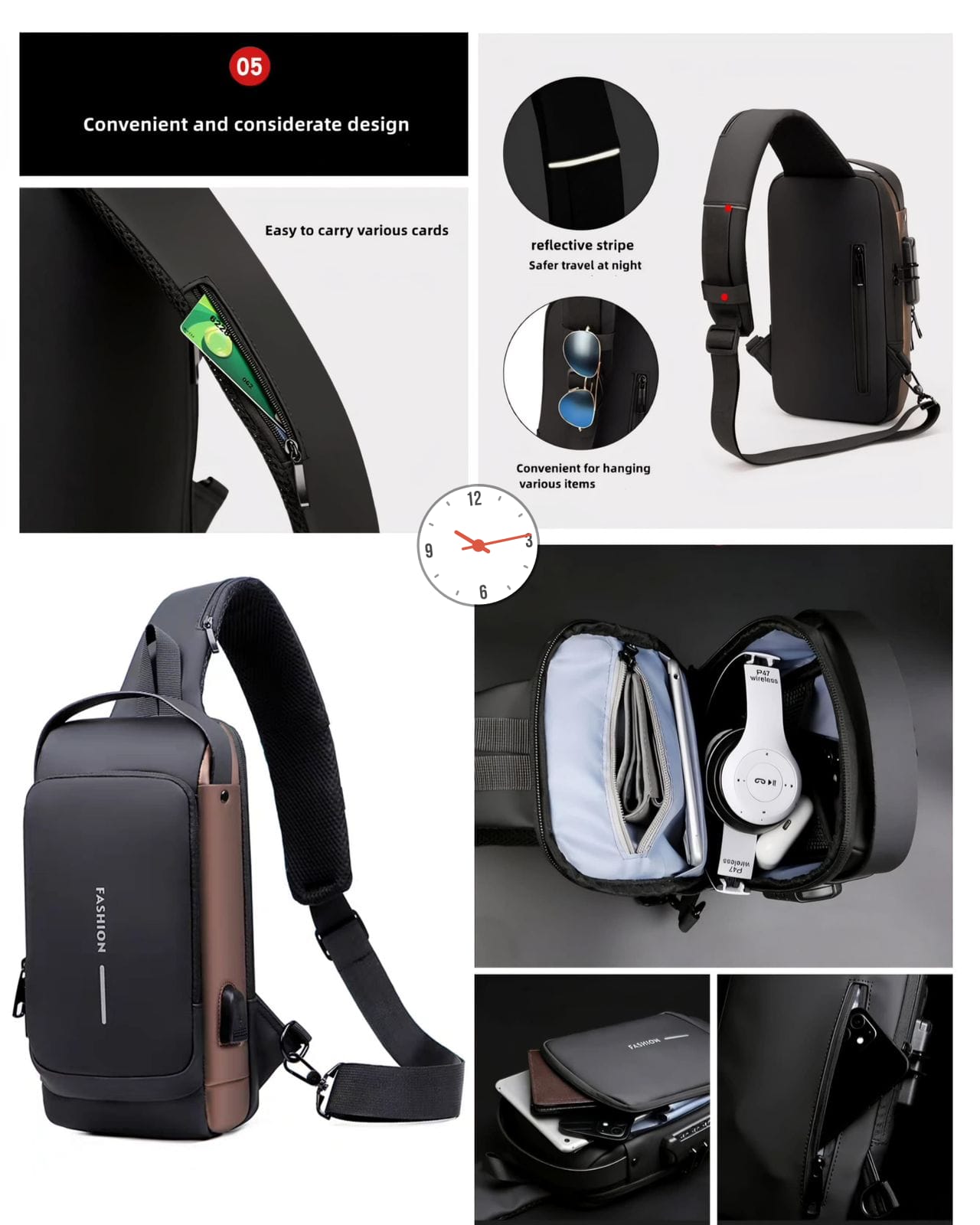 The bag features a hidden anti-theft zipper and lock, making it ideal for crowded places and travel. A reflective strip improves visibility and safety during night walks or cycling. The built-in USB charging port lets you charge your phone easily while on the move (power bank not included).