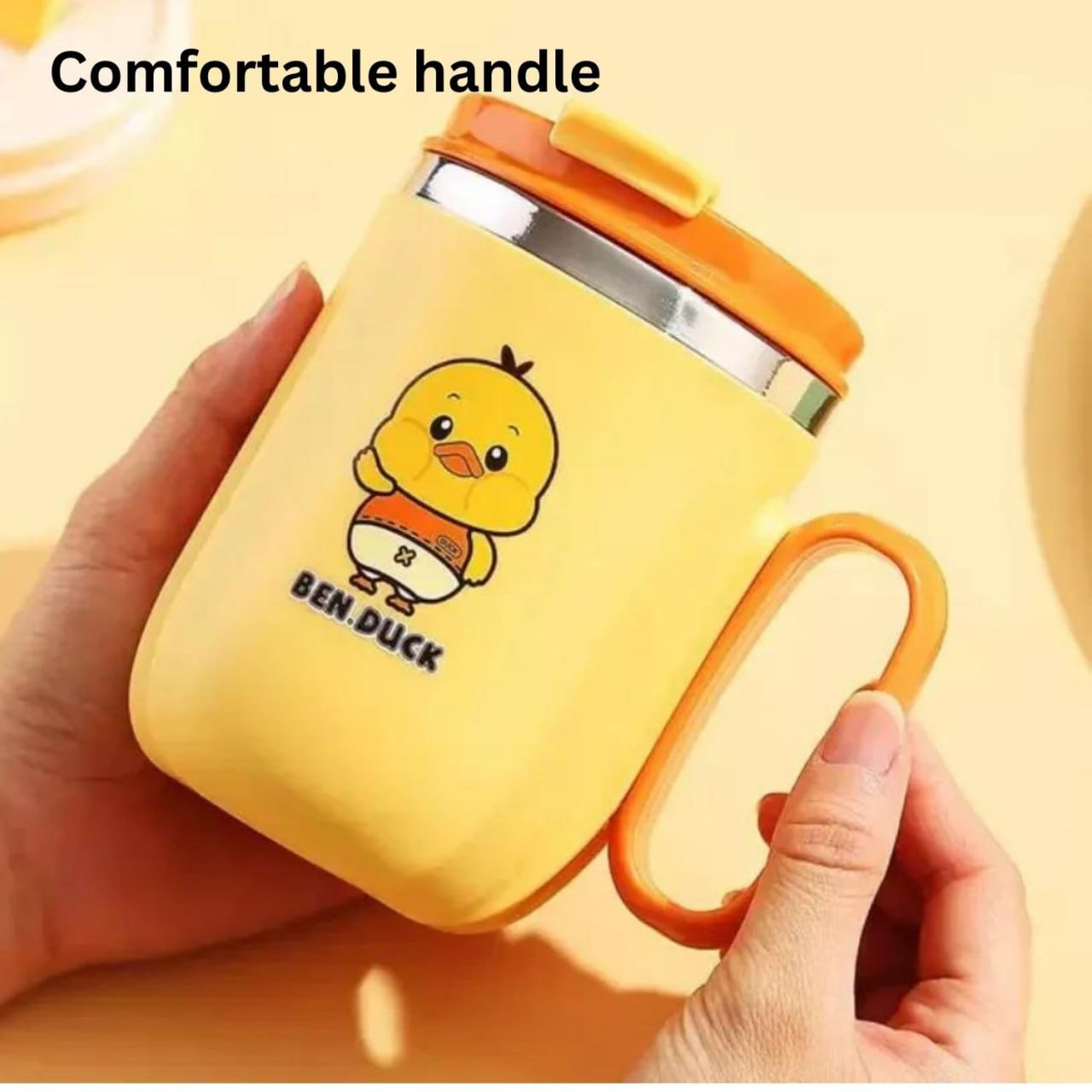 Adorable cartoon mug designed for kids with a comfortable handle and spill-resistant lid. Perfect for milk, juice, water, or warm drinks at home or school.