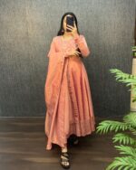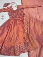 Step into elegance with this luxurious Peach Embroidered Anarkali Gown Set. Featuring a beautifully crafted embroidered yoke, rich sheen fabric, graceful full flare, and a designer dupatta, this outfit blends comfort with royal charm—making it ideal for weddings, receptions, festivals, parties, and traditional celebrations.