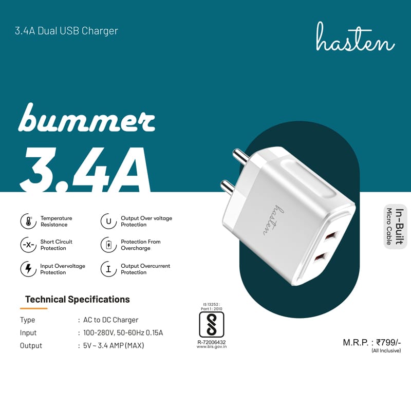 - The Hasten 3.4A Dual USB Fast Charger is a powerful and reliable mobile charger designed to deliver rapid charging for all smartphones. With a total output of 17W, two USB ports and in-built fast charging cable, it allows you to charge two devices simultaneously at high speed.