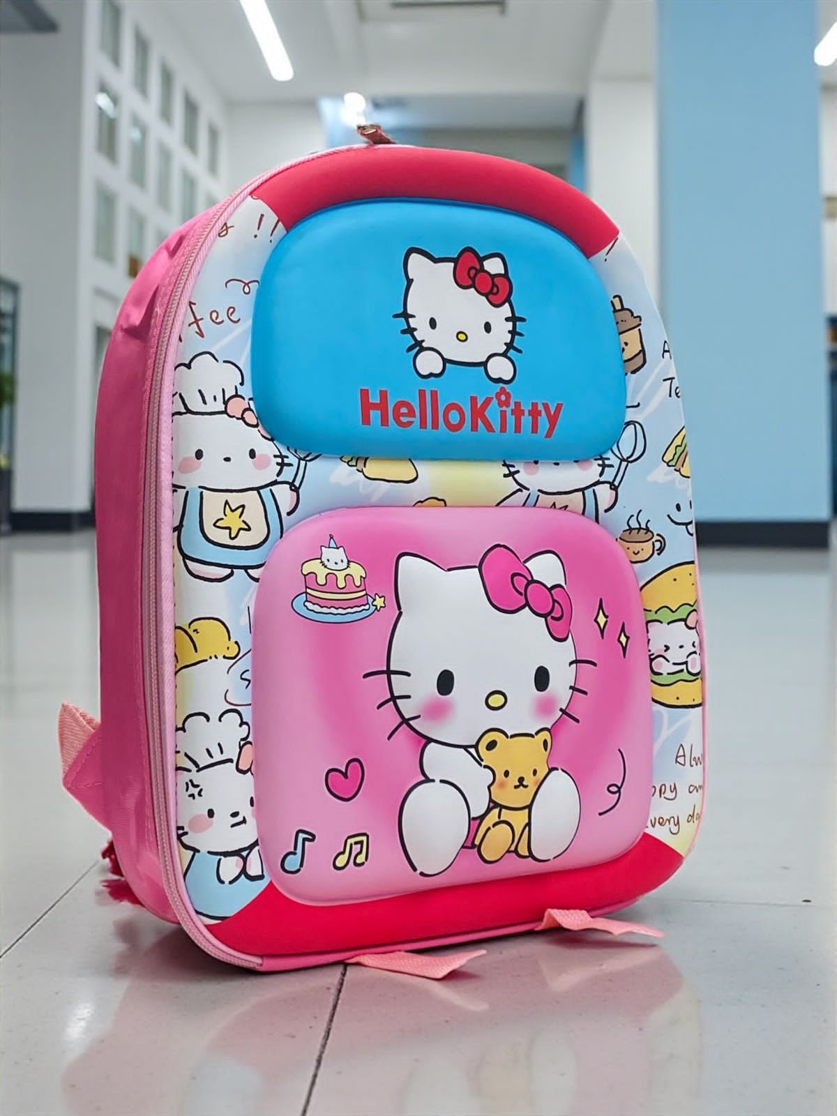 Cute Hello Kitty kids backpack with colorful cartoon design. Lightweight, spacious, and comfortable for daily school use, travel, and outings.
