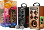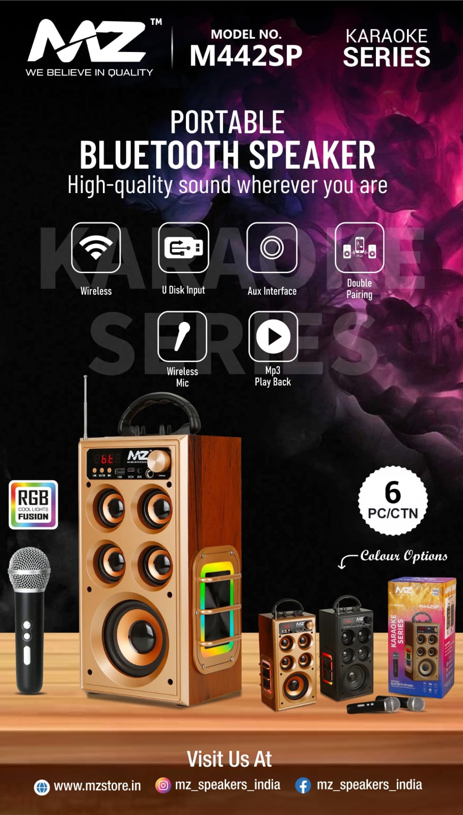 Turn every moment into a party with the MZ M442SP Portable Bluetooth Karaoke Speaker. Designed with high-quality wooden cabinet sound design and premium bass output, it delivers crystal-clear audio and deep punchy bass.
