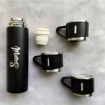 Stylish stainless steel vacuum bottle with 3 matching cups. Keeps drinks hot or cold for up to 12 hours. Perfect for travel, office & gifting.
