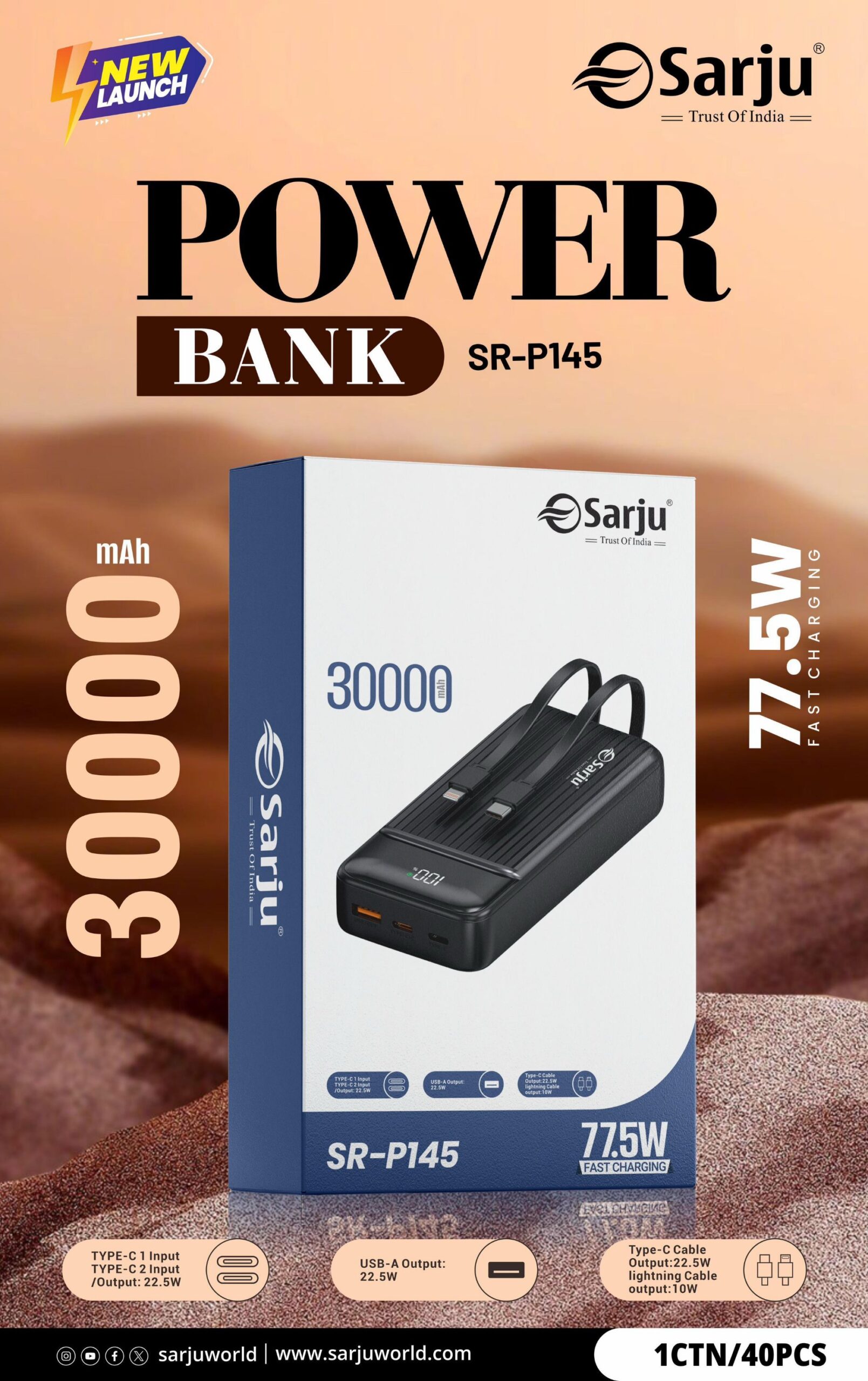 Sarju SR-P145 30000mAh power bank with 77.5W fast charging, dual Type-C ports, USB-A output, built-in cables, and digital display—perfect for travel and daily use.