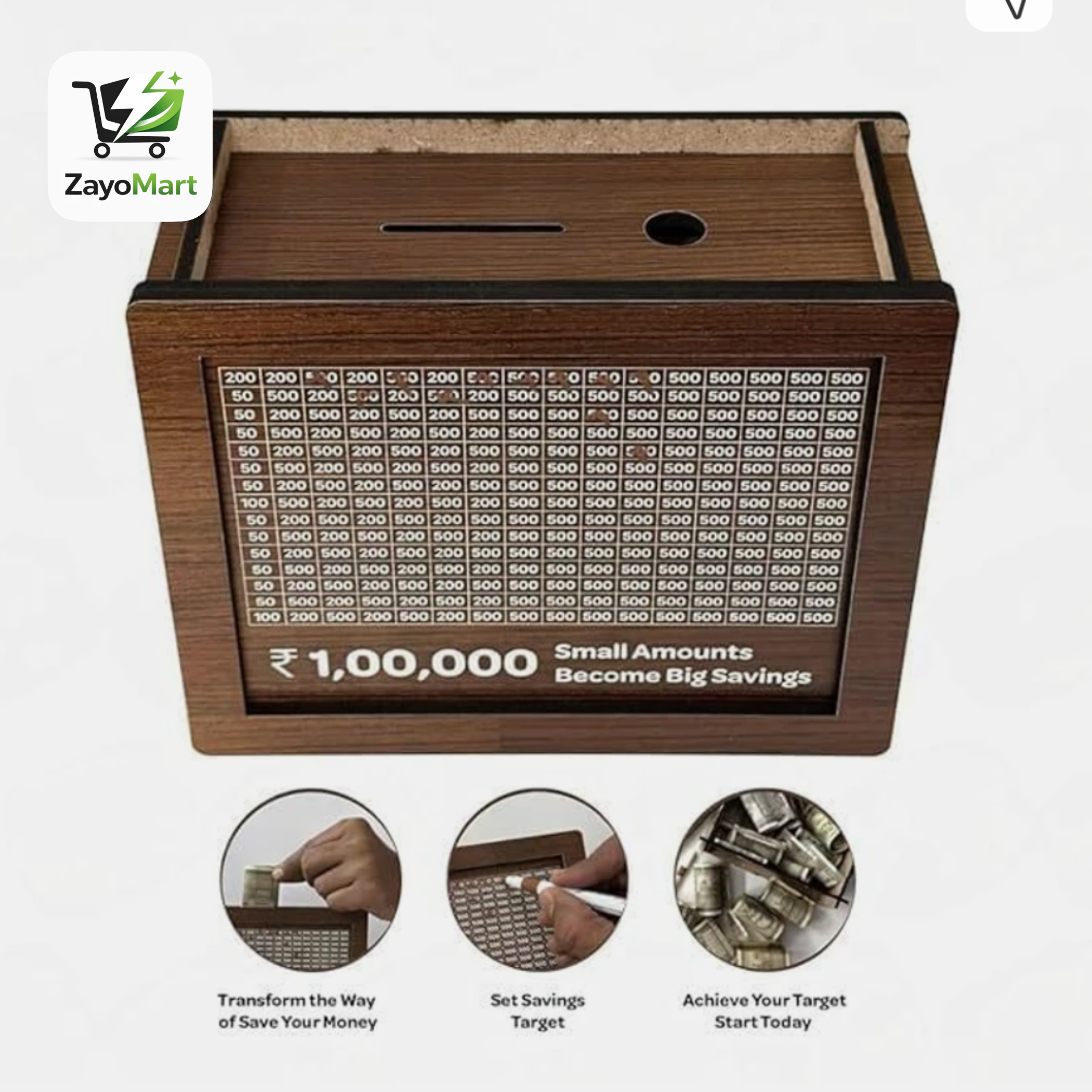 Build a smart saving habit with this stylish Wooden Savings Challenge Money Box. Designed with a printed tracker grid on the front panel, this undiyal helps you systematically save small amounts and monitor your progress easily.
