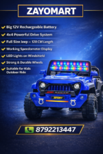Powerful kids electric 4×4 Jeep with 12V rechargeable battery, LED lights, rugged wheels and premium build. Ideal for homes, toy stores, rentals and bulk buyers.