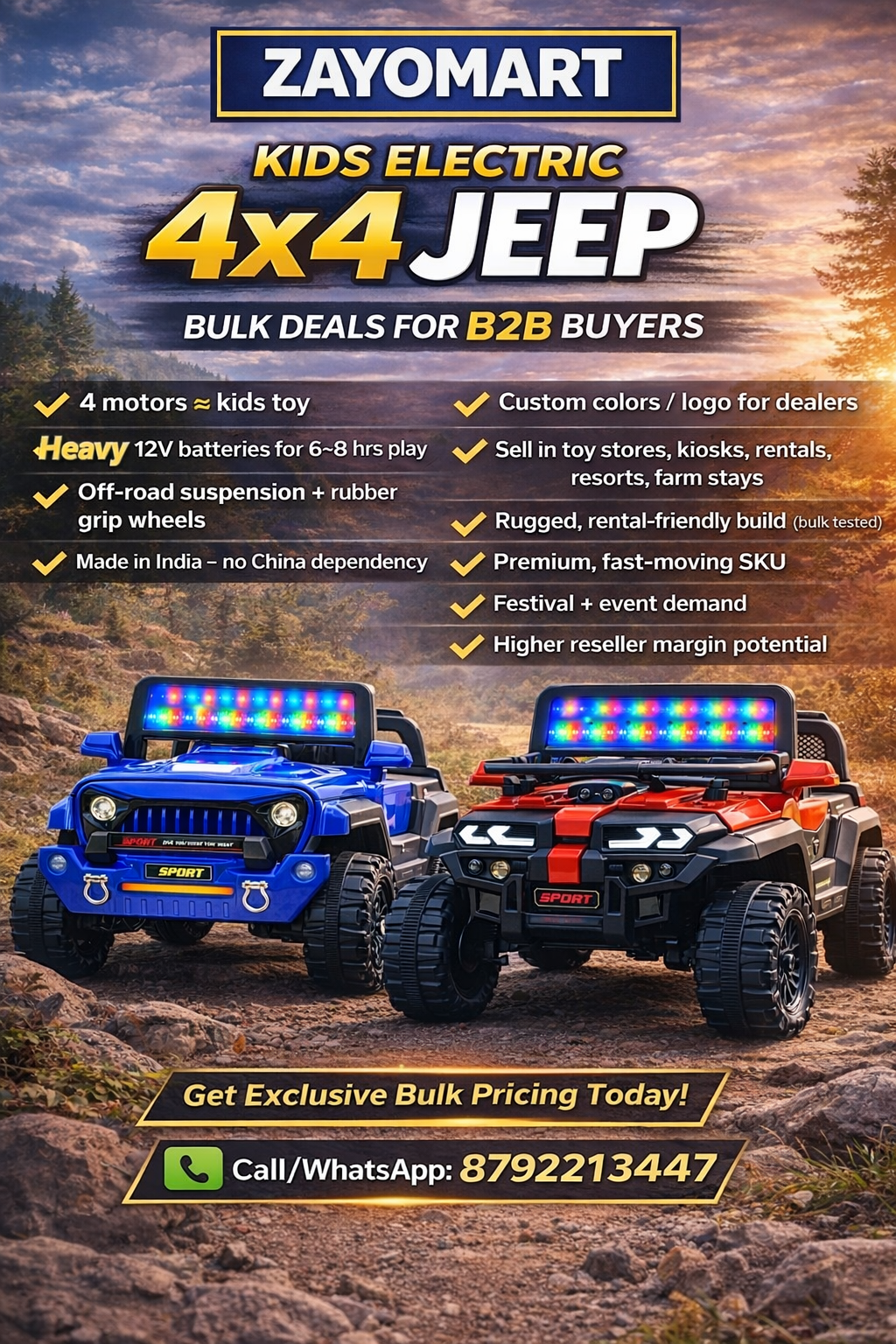The Jeep features bright LED lights, a realistic jeep design, and strong rubber-grip wheels with off-road suspension for safe and stable rides. Its heavy-duty build quality makes it suitable not only for home use but also for toy stores, rentals, resorts, events and bulk resale.